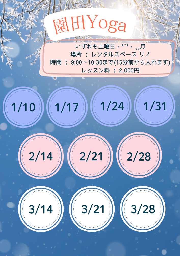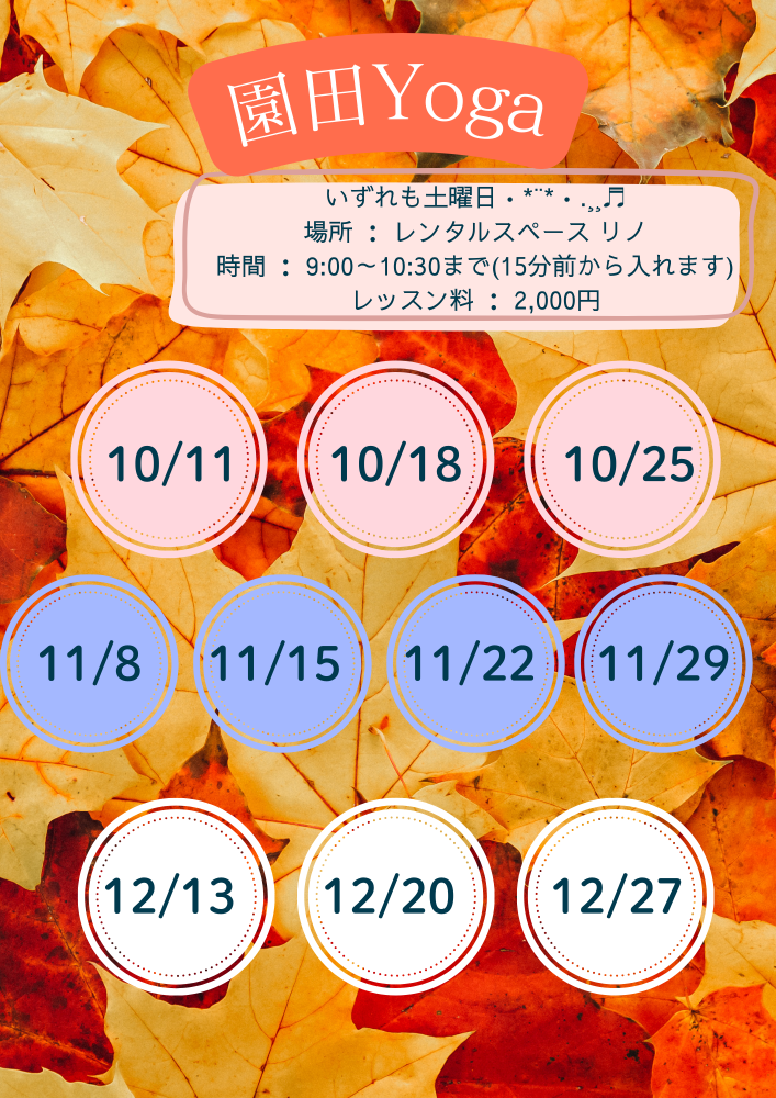 2024年11月より園田スタジオでのヨガレッスンを再開します。レンタルスペース リノ にて会費 2千円/回ビジターの方は1レッスン3千円です。お問合せください